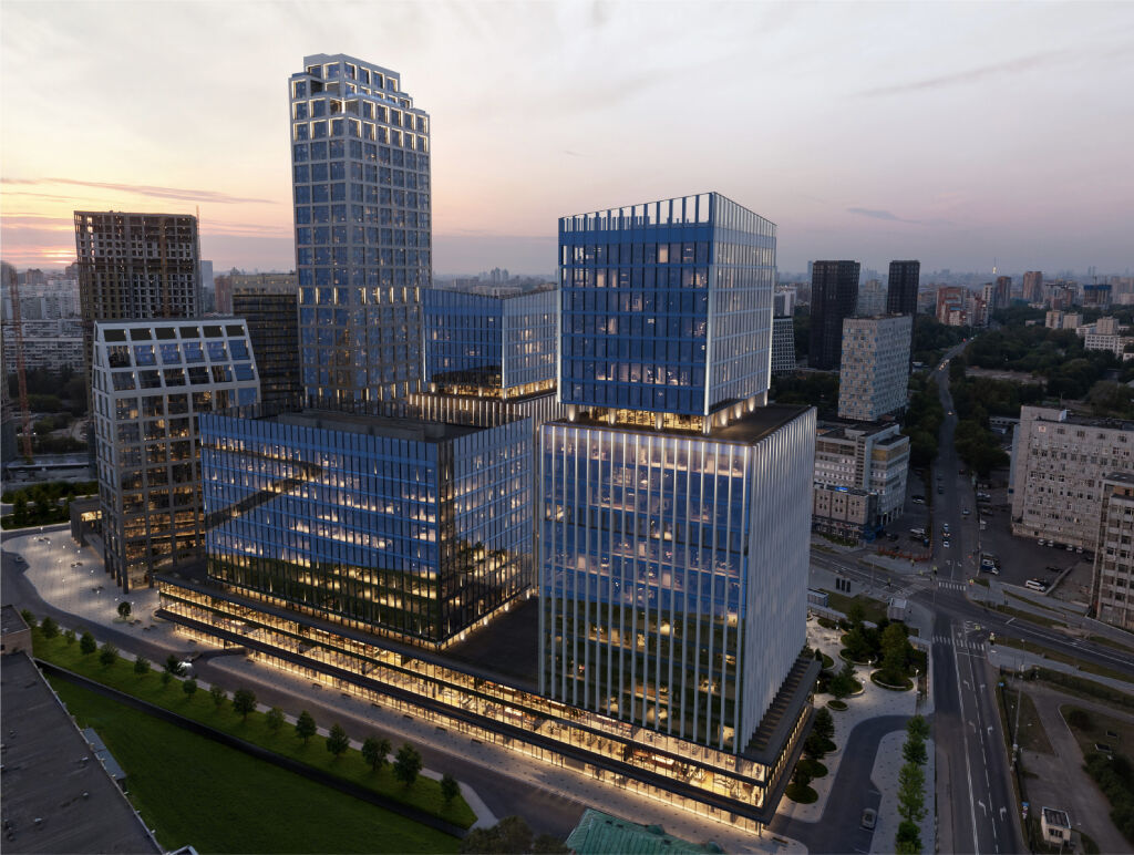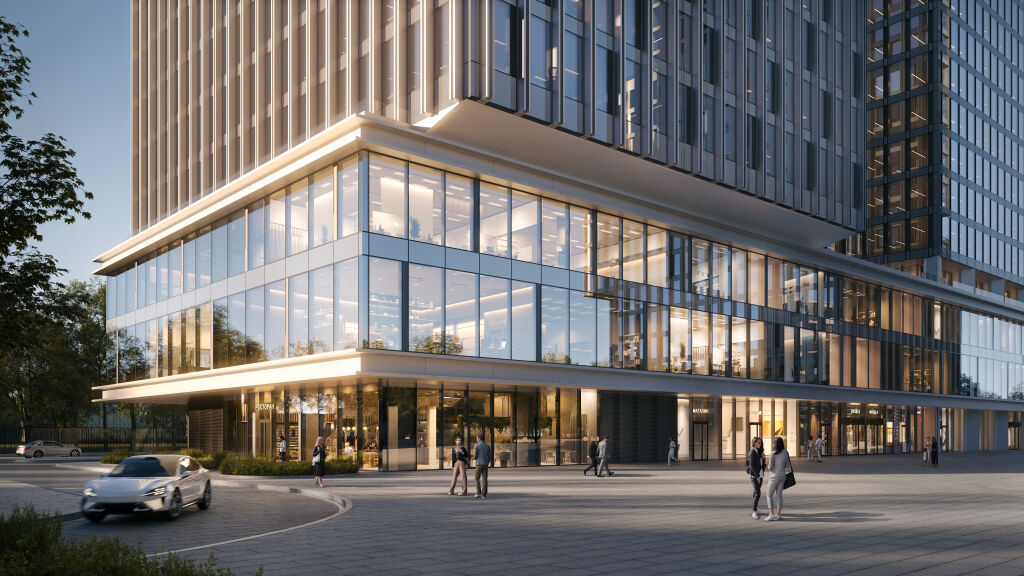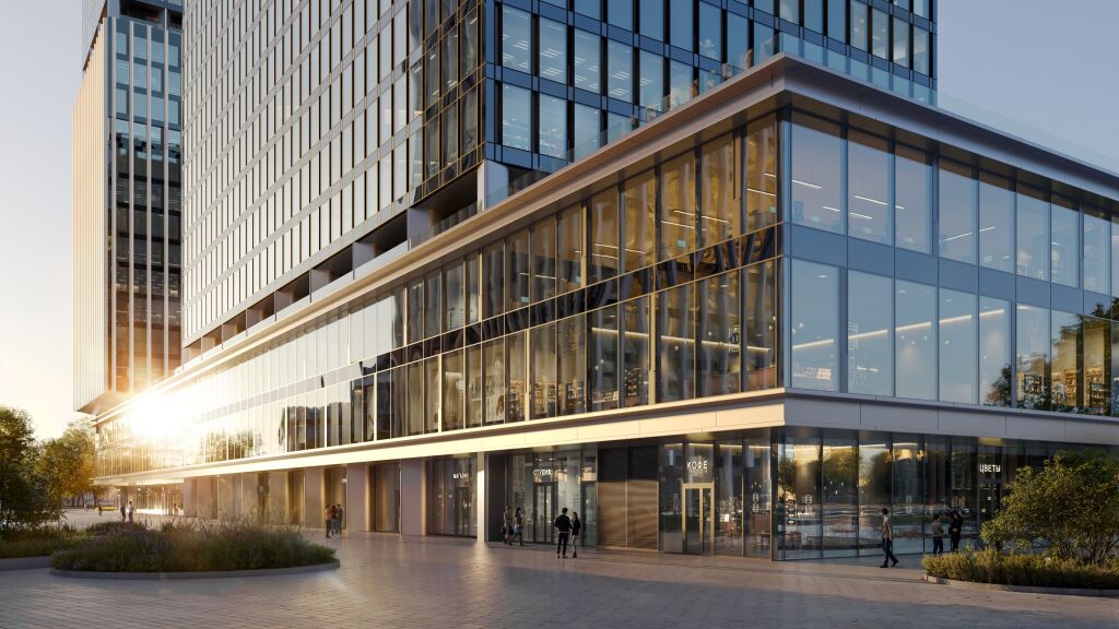 Архитектура от Kleinewelt Аrchitekten. В состав проекта войдут три разноэтажные офисные башни высотой в 23, 13 и 20 этажей. Корпуса соединены стилобатной частью — торговой галереей с эскалаторами и зонами для отдыха, на крыше которой расположены выходы из офисов на террасу. Верхние этажи башен выполнены в динамичных, устремленных вверх формах. Главный вход одного из зданий акцентирован эффектной высокой аркой, которая придает фасаду выразительность и гармонично интегрирует комплекс в городскую среду. Пространство также включает в себя продуманную систему озеленения с прогулочными маршрутам, многофункциональные зоны отдыха, а также современные павильоны для работы на открытом воздухе.