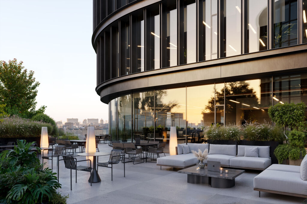 Архитектурную концепцию проекта разработало бюро Kleinewelt Аrchitekten. Чистая и стройная структура здания будет гармонично вписана в зеленый ландшафт прилегающего парка. Фасады из стекла и металла украсят динамичные ламели, а полукруглая форма башен отсылает к форме парка «Ходынское поле». Дизайн-концепция лобби от KEMELIN PARTNERS в натуральных материалах с двусветным пространством, зонами ожидания, стойками ресепшен и лифтовыми холлами объединила комфортную логистику с мультформатной средой: это комфортные бизнес-гостиные с кофе-поинтами, лаунж-зоны для неформального общения и отдыха, переговорные комнаты, а также пространство с амфитеатром, где можно будет устроить кофе-паузу и насладиться умиротворяющим видом на парк Ходынское поле.